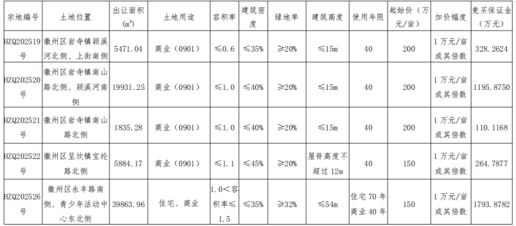 徽州区4宗商业、1宗商住用地挂牌,其中商住用地起拍楼面地价1500元/㎡