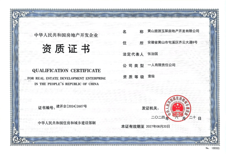 黄山市首家! 黄山旅游集团玉屏地产获批房地产开发企业一级资质