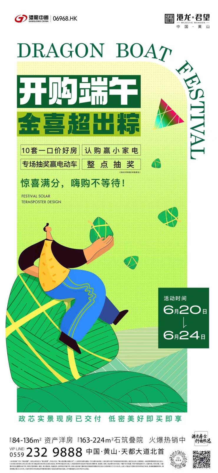 港龙君望,开购端午,金喜超出粽!6月20日-24日,10套一口价好房、认购赢小家电、专场抽奖赢电动车、整点抽奖,惊喜满分,嗨购不等待!政芯实景现房,低密美好即买即享!建面约84-136㎡资产洋房、163-224㎡石筑叠院火爆热销中!