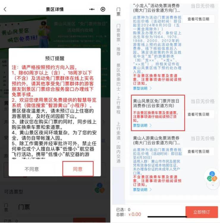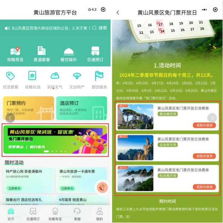1.游客进入“黄山旅游官方平台”支付宝或微信小程序,点击首页“免门票开放日”活动轮播图进入活动页面;