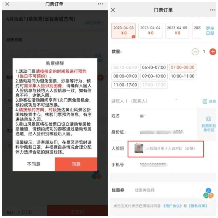 3.选择日期和入园时间段,录入身份信息后进行人脸信息录入,请确保人脸与身份证一致,否则现场核检无法入园;