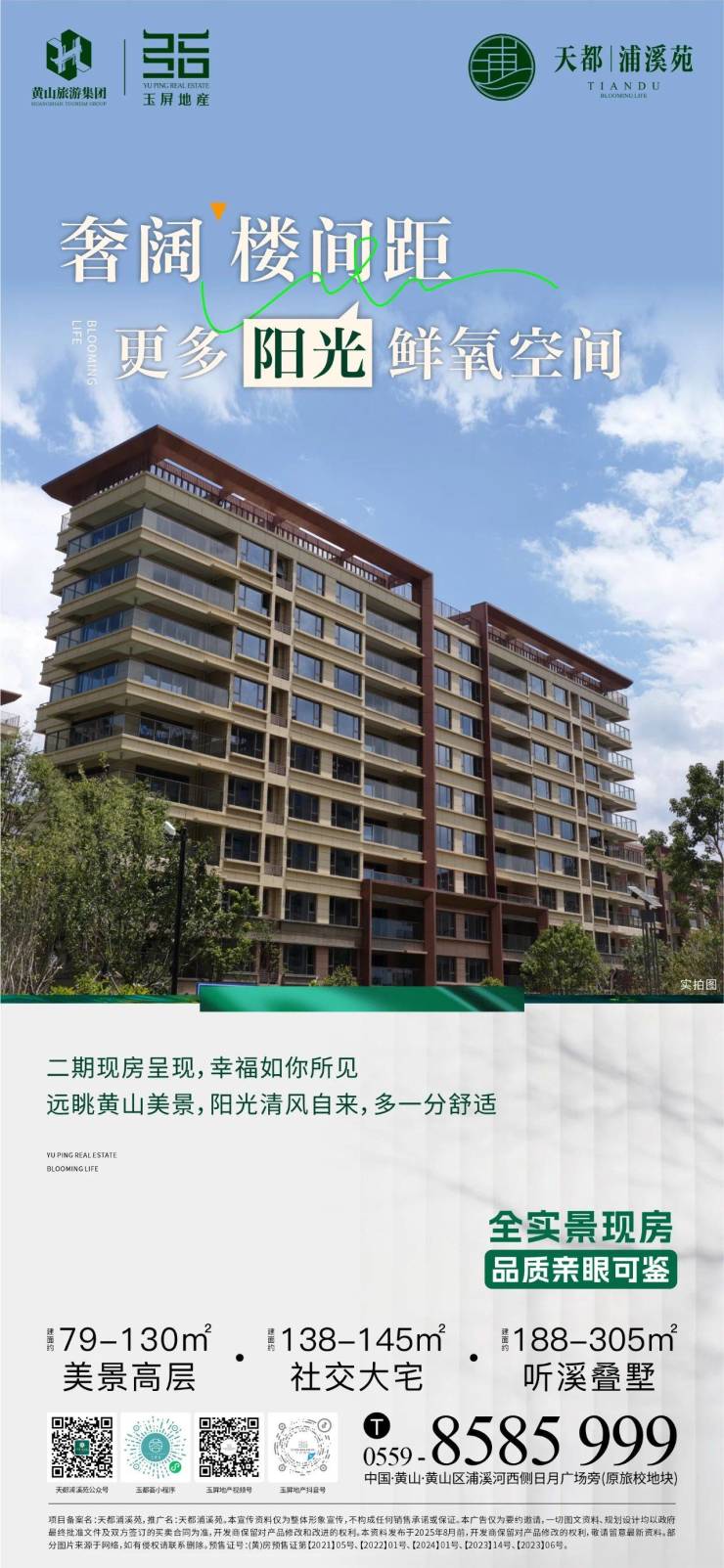 全实景现房,品质亲眼可鉴。天都浦溪苑79-130㎡美景高层、138-145㎡社交大宅、188-305㎡听溪叠墅热售中。