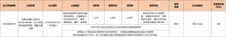 2026年1月12日,屯溪区帅鑫下窖单元SX-02-06地块挂牌,地块位于阳湖镇,医院路南侧、帅鑫大道北侧,土地性质为商业用地/商务金融用地,出让面积12725.45平方米(19.09亩),起拍总价:1641.5831万元,起拍单价:86万元/亩(1290元/㎡),起拍楼面地价:678.9元/㎡。容积率R≤1.9。拍卖时间:2026年2月11日15时30分。