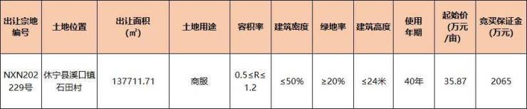 休宁县1宗206.57亩商服用地挂牌出让,起拍单价538元/㎡