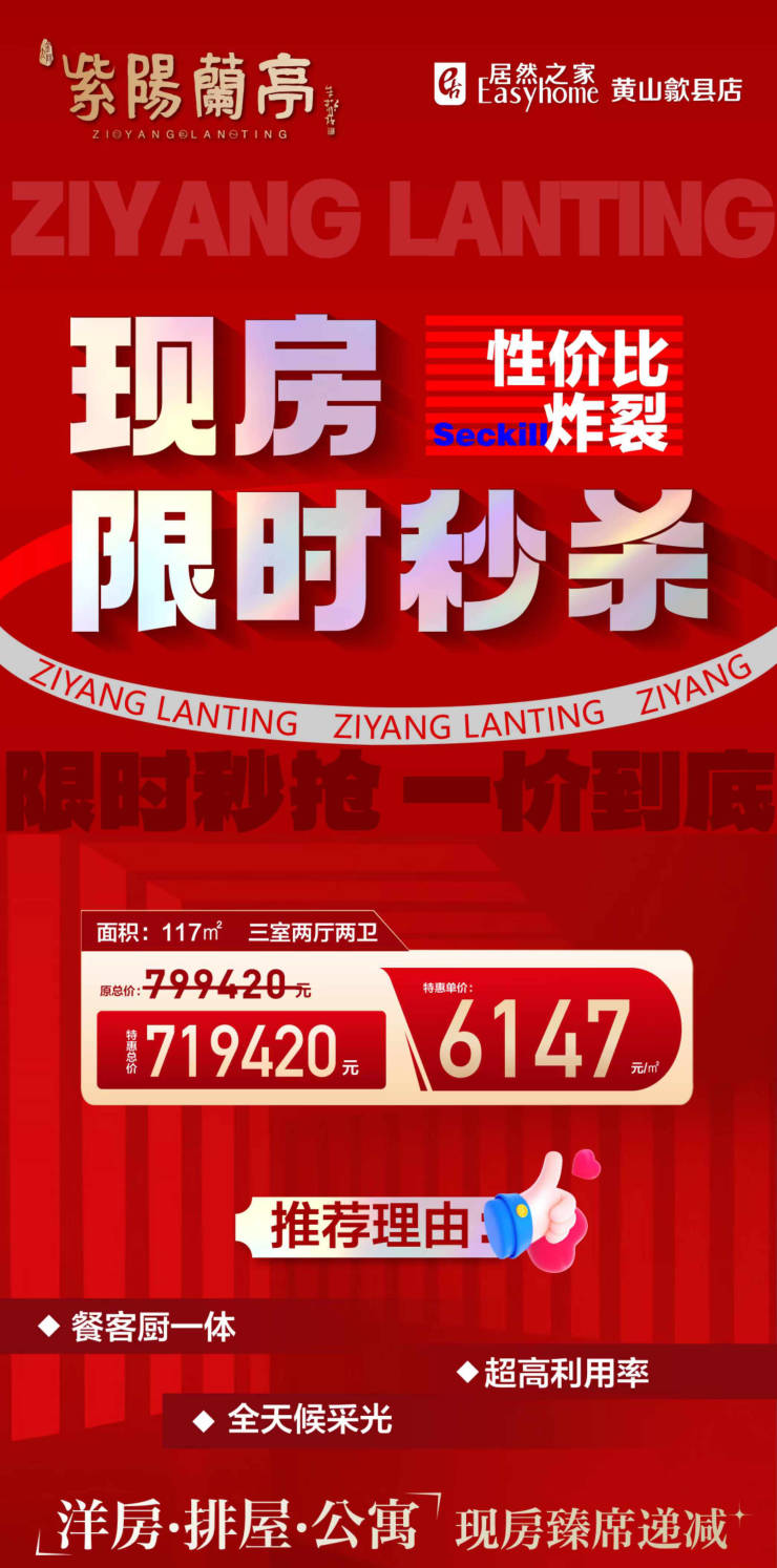 紫阳兰亭现房限时秒杀,一价到底。建面约117㎡三室两厅两卫,餐客厨一体、全天候采光、超高利用率,限时特惠总价719420元。紫阳兰亭,洋厉·排屋·公寓 现房臻席递减中。