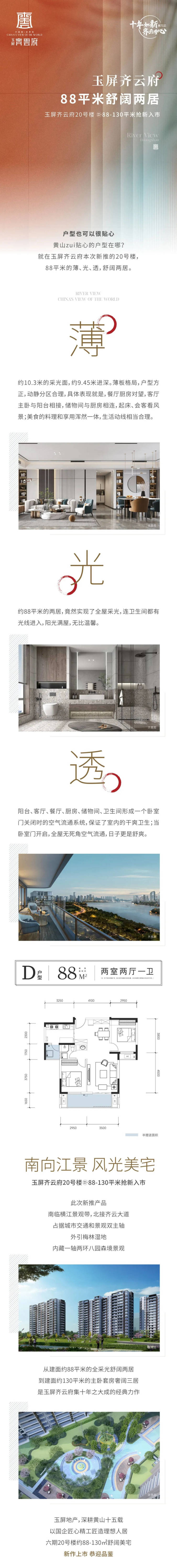 玉屏齐云府六期新品首开在即,20#楼揽江新作将率先入市,共计105席房源,建面约88-130㎡,备案均价8350元/㎡。…