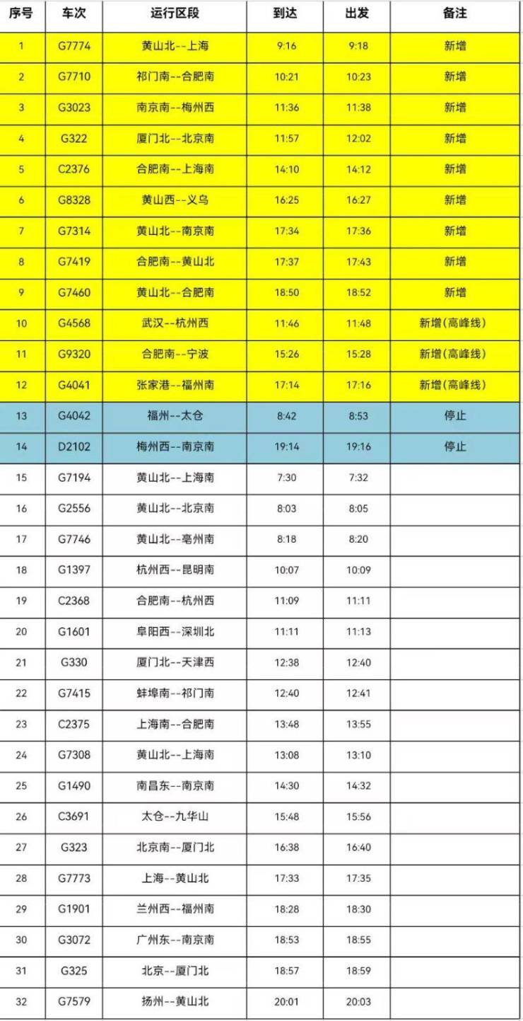 高铁歙县北站在二季度图定(20列,含1列高峰线)办客的基础上增加办客12列(含3列高峰线),停止办客2列,实际增加办客10列。停止办客的列车为:福州~太仓G4042次(高峰线,到发时刻8:42/8:53)、梅州西~南京南D2102次(到发时刻19:14/19:16)。