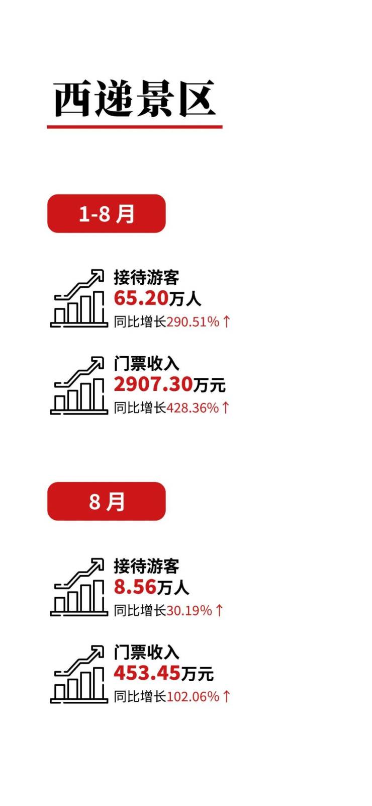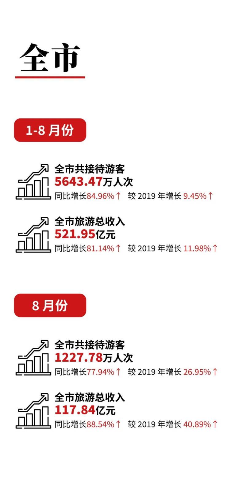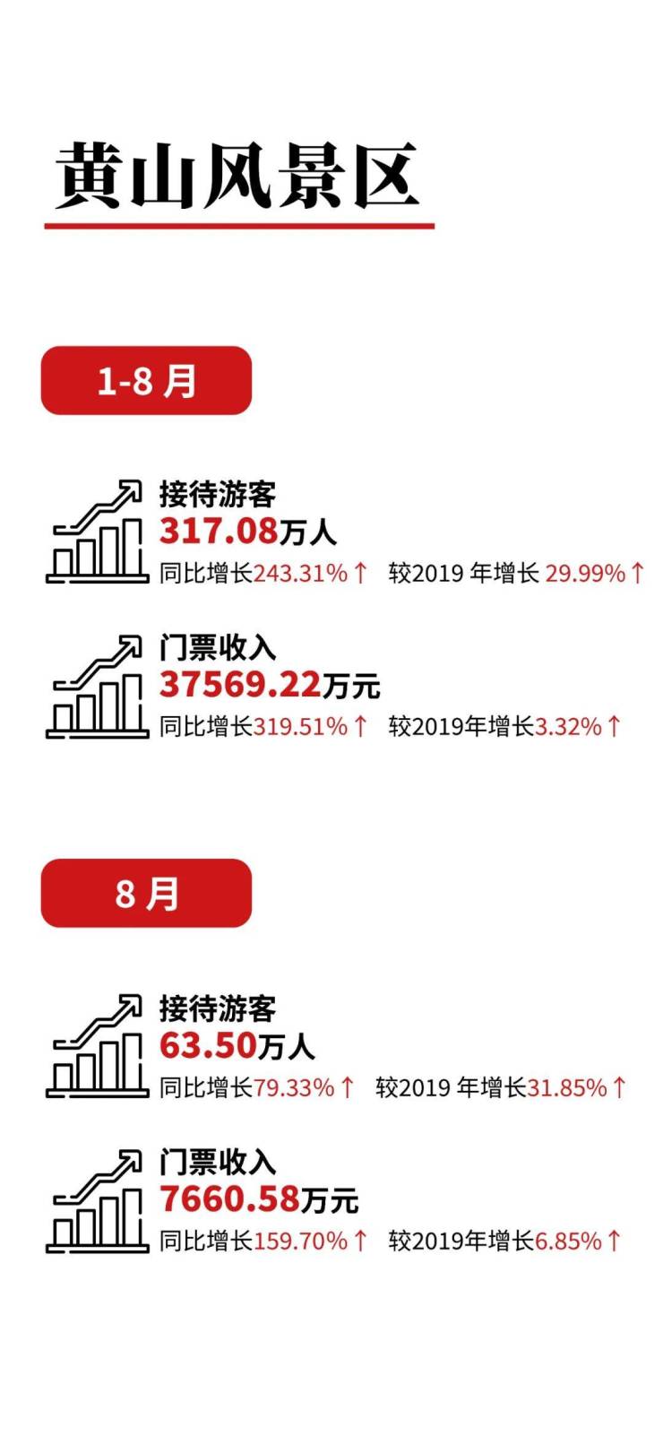 1-8月份,黄山市共接待游客5643.47万人次,同比增长84.96%↑较 2019年增长9.45%↑。