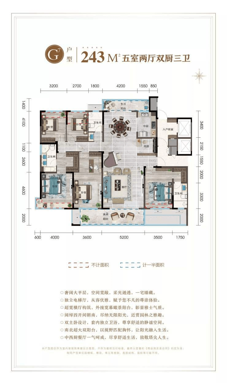 好的产品始终是站在“人”的角度出发去设计。紫阳兰亭243㎡大平层双主卧套房设计,并配备有270°转角外飘窗或大尺度阳台,多向采光增加观景效果;阔绰的衣帽间设计,装得下所有场合最为适宜的衣服,阔绰大气,方便舒适。主卧内宽敞豪华的卫生间,将私密性做到了优质。配置明亮的透气窗,在疲累的时候一览室外的美景。