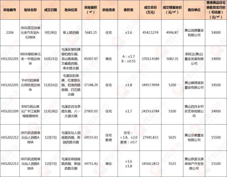 2022年黄山中心城区成交的6宗涉宅用地,全部底价成交,0溢价。6宗涉宅用地的成交楼面地价在4996.87-5525元/㎡之间,官方指导商品住宅销售备案均价(毛坯房)在14000-15100元/㎡之间,同区域同地段的涉宅地成交楼面地价同比去年下降明显,降幅接近20%,土拍热度大不如前。