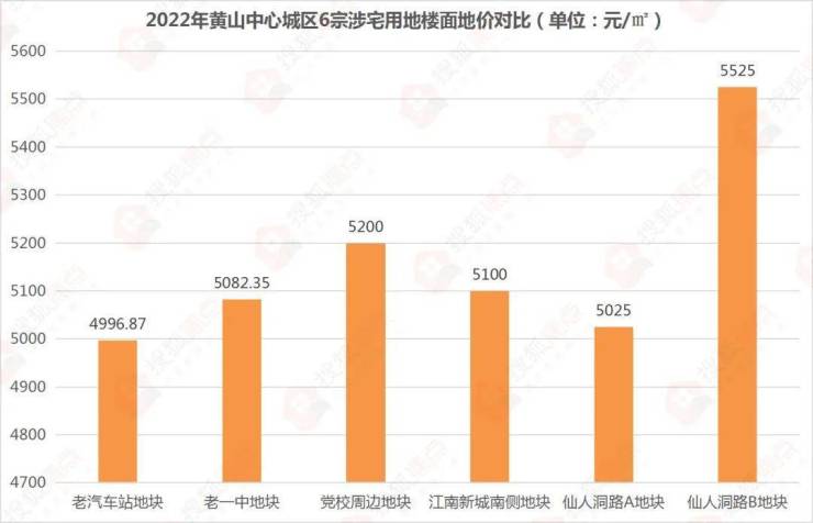 2022年12月7日,黄山旅游玉屏房地产开发有限公司竞得的仙人洞路B地块,成交楼面地价5525元/㎡,为2022年黄山中心城区楼面地价最高地块。
