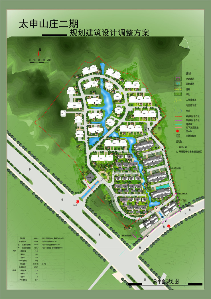 太申山庄项目位于齐云大道与竹林路交口北侧,我局于2005年批复,项目一期已建成。因项目用地范围调整,建设单位申请对规划方案进行调整,调整后具体为:A地块用地面积68400平方米,计容建筑面积33286平方米,容积率0.49,主要为1-6层低多层建筑,一期已建成面积18073平方米;B地块用地面积4248.78平方米,计容建筑面积5098平方米,容积率1.2,为两栋8层建筑。经审查,建筑间距、退让等指标满足相关技术规范要求。根据有关规定,现将调整后规划总平图、效果图予以公示,如有意见和建议,请在公示期内向我局反馈。