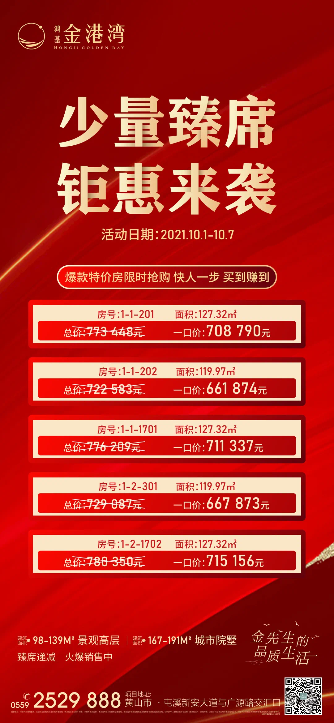 热销,是鉴定市场和产品的重要标准。从诚意登记的热势如虹到开盘的鼎沸全城,鸿基·金港湾的每一次动作都牵动着黄山置业人群的目光。以实力验证品牌力量,以追捧鉴证红盘魅力,9月19日,鸿基·金港湾首次开盘不负一城厚爱,以一份硬核答卷向大家诠释了什么叫“红盘的基本素养”。