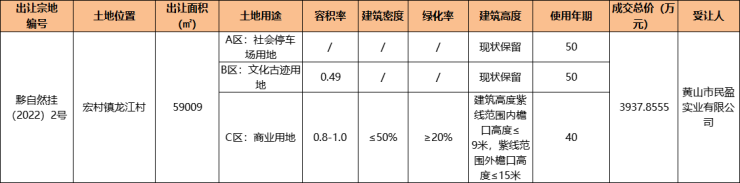 黟县宏村镇1宗社会停车场、文化古迹、商业用地成交,成交总价3937.8555万元