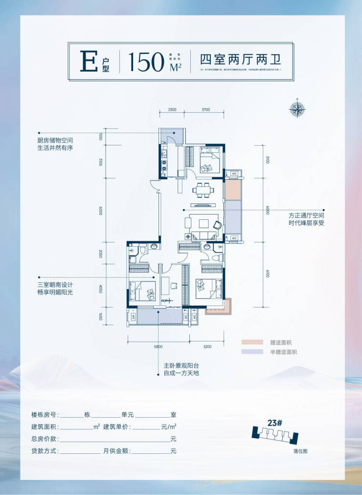 产品设计上,23#楼也进行了优化与升级,建面约130-150㎡的户型空间,深度洞察现代家庭生活的每一个细微需求,合理的空间布局,让您的居住环境更显豪华与舒适。通厅设计,不仅拓宽了视觉边界,让空间更加开阔明亮;宽景阳台完美过渡室内与自然,尽情享受江景风光带来的惬意与舒适;生活储物空间人性化的设计,让家的每一个角落都显得井然有序,提升整体生活品质。