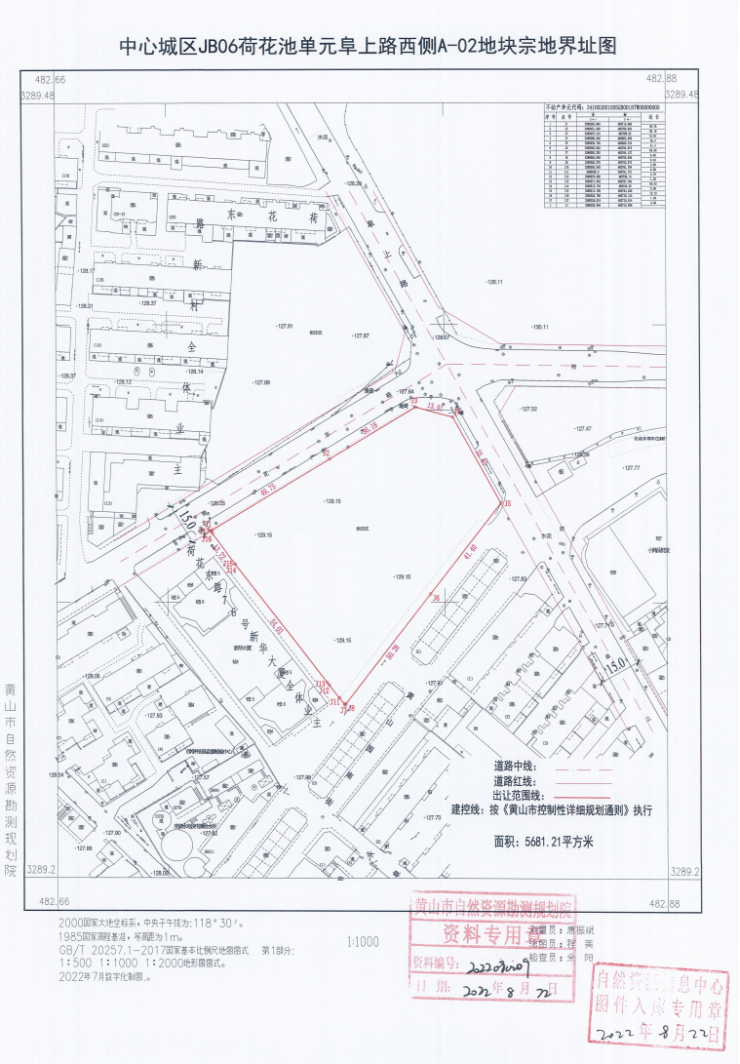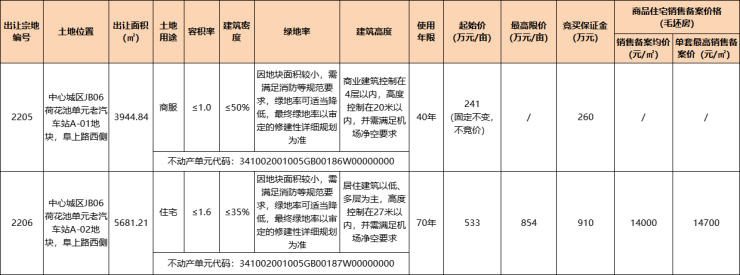 2022年8月23日,黄山中心城区JB06荷花池单元老汽车站A-01地块(宗地编号:2205)、A-02地块(宗地编号:2206)挂牌,两宗地块位于黄山中心城区原老汽车站区域,阜上路西侧。其中,A-01地块土地用途为商服,出让面积为3944.84㎡(5.91726亩)、容积率≤1.0;A-02地块土地用途为住宅,出让面积为5681.21㎡(8.521815亩)、容积率≤1.6,毛坯房商品住宅销售备案均价14000元/㎡,单套较高销售备案价14700元/㎡。