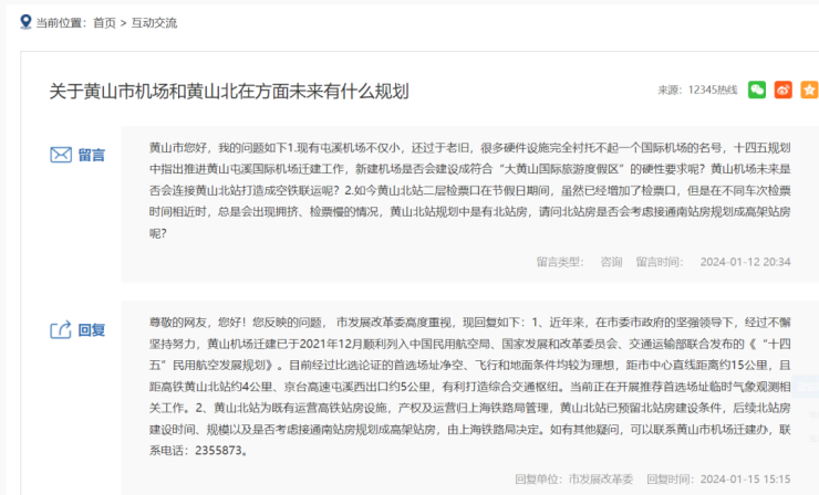 对上述咨询,黄山市发改委答复称,近年来,在市委市政府的坚强领导下,经过不懈坚持努力,黄山机场迁建已于2021年12月顺利列入中国民用航空局、国家发展和改革委员会、交通运输部联合发布的《“十四五”民用航空发展规划》。目前经过比选论证的首选场址净空、飞行和地面条件均较为理想,距市中心直线距离约15公里,且距高铁黄山北站约4公里、京台高速屯溪西出口约5公里,有利打造综合交通枢纽。当前正在开展推荐首选场址临时气象观测相关工作。