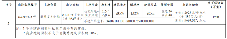 SX202525 号地块位于歙县富丰新城,住宅+商业用地,出让面积:33128.23(合 49.69 亩),起拍总价:9690.0073万元,起拍单价:2925 元/㎡(195 万元/亩),起拍楼面地价:1828.125元/㎡。地块不得建设别墅和私家庄园形态的建筑;商业建筑面积不大于地块总建筑面积的 10%。