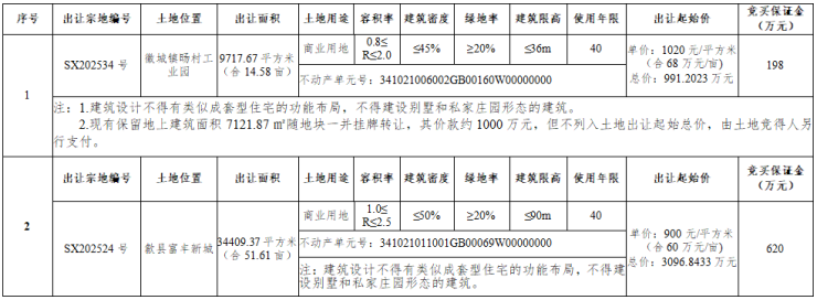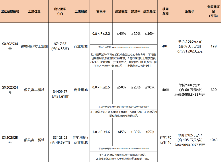SX202534号地块位于徽城镇旸村工业园,商业用地,出让面积:9717.67 (合14.58亩),起拍总价:991.2023万元,起拍单价:1020元/㎡(68 万元/亩),起拍楼面地价:510元/㎡。地块建筑设计不得有类似成套型住宅的功能布局,不得建设别墅和私家庄园形态的建筑。