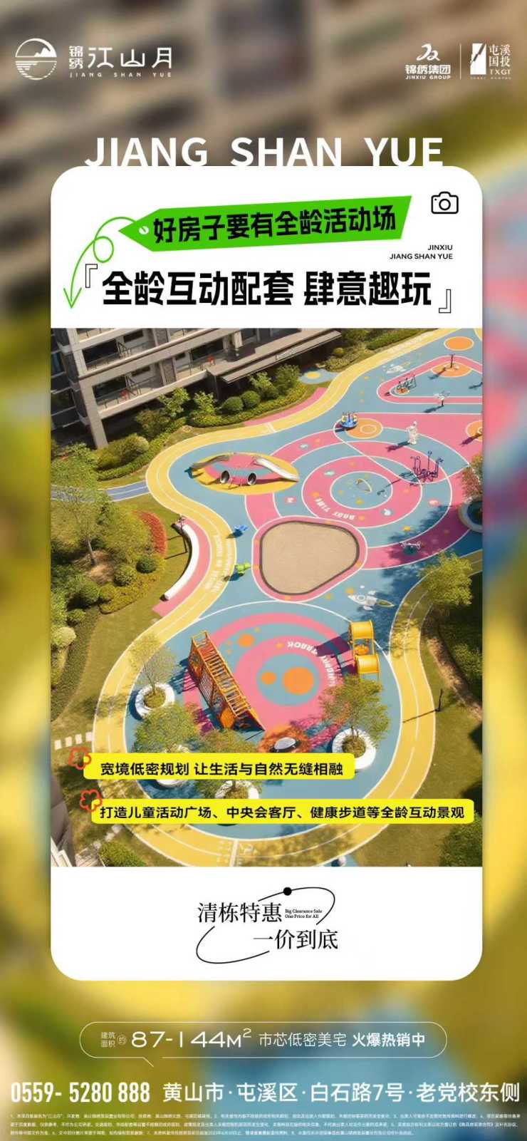 好房子要有全龄活动场。锦绣江山月,宽境低密规划让生活与自然无缝相融,打造儿童活动广场、中央会客厅、健康步道等全龄互动景观,肆意趣玩。清栋特惠,一价到底,锦绣江山月建面约87-144㎡市芯低密美宅现房热售中。锦…