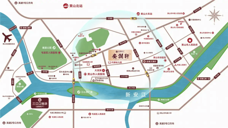 项目自身配建九班制幼儿园,解决了幼儿入园的近忧;500米生活圈内,大润发、百大等商圈环伺,满足日常高频的购物与餐饮需求;教育资源方面,屯溪六小、屯溪三中等优质学校临近,为子女就学提供了切实的保障。一站式生活圈的成型,极大降低了家庭的日常运营成本。
