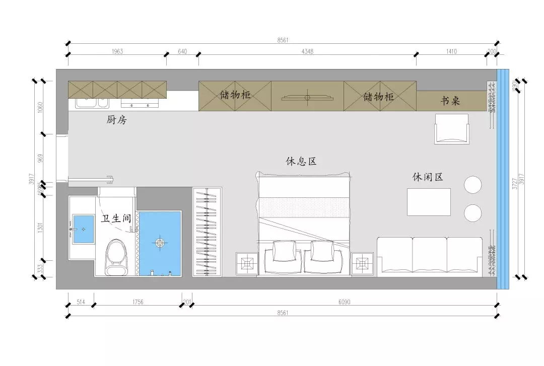 当然这都是从居家的角度来做空间功能布局,除此之外,海伦公寓也很适合年轻人创业工作室的空间规划,由于开间和进深的尺寸的合理搭配,不仅从面宽上可以布局文件柜解决很多文件收纳,