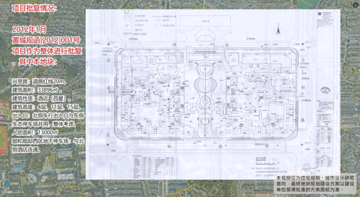 根据2012年1月 黄城规函 【2012】001号,项目作为整体进行批复。其中本地块,建筑面积:33896m,建筑性质:酒店(四星),建筑高度:4层、11层、15层。