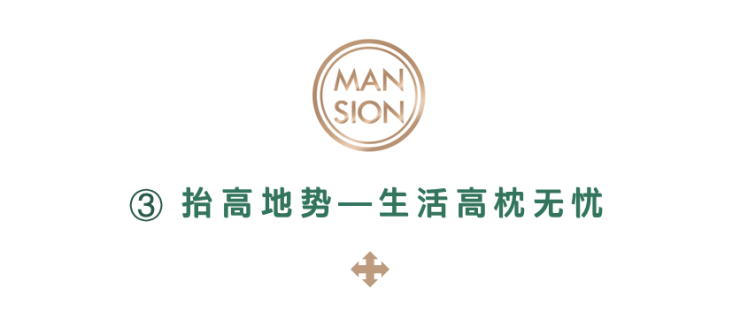 项目整体地势抬高,受外界干扰更小,有效隔离外界尘土、噪音,采光更充足,小区整体的私密性和居住的纯粹性更高。同时,抬高地势能够最大限度化解梅雨季节容易引发的积水、潮湿等问题。居高俯瞰,视野开阔;步步高升,运势通达。