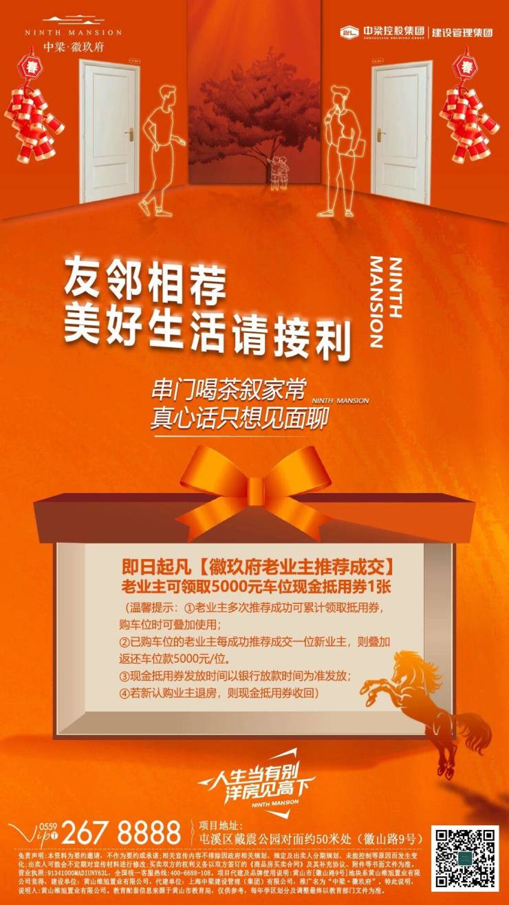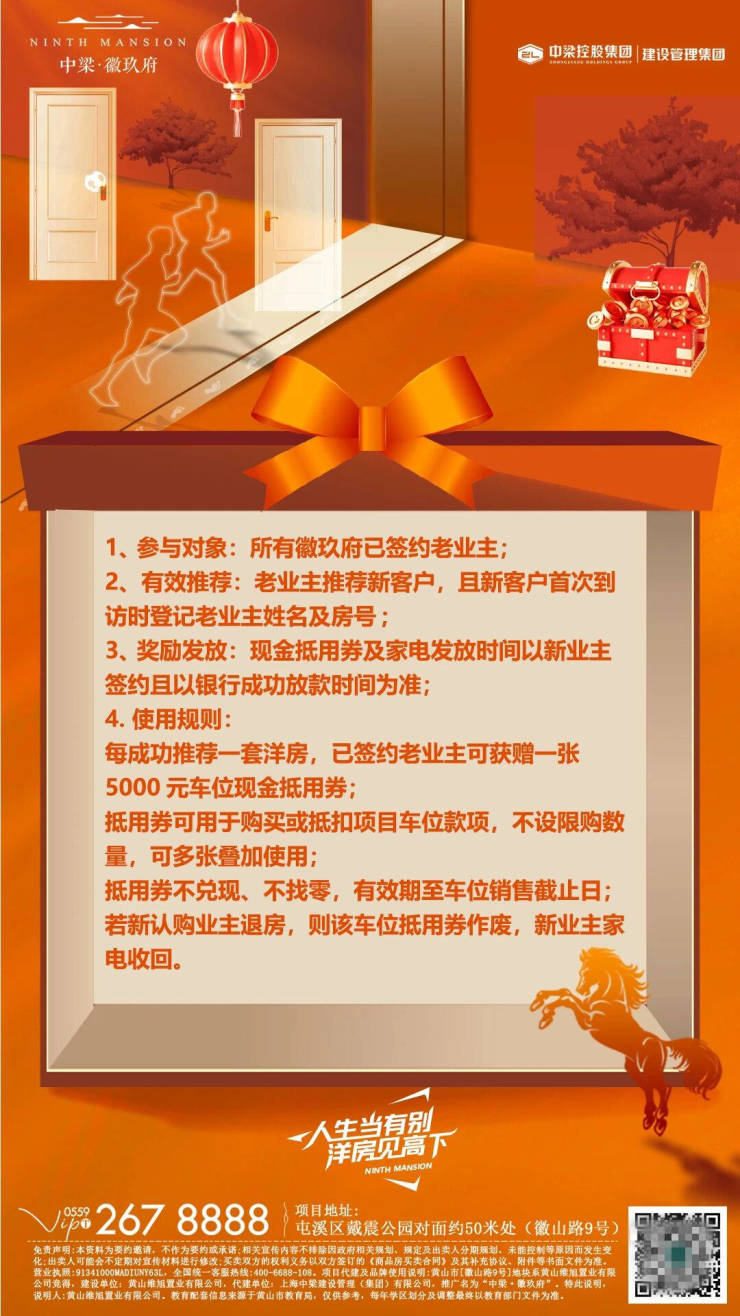即日起凡【徽玖府老业主推荐成交】,老业主可领取5️⃣0️⃣0️⃣0️⃣元车位现金抵用券1张!