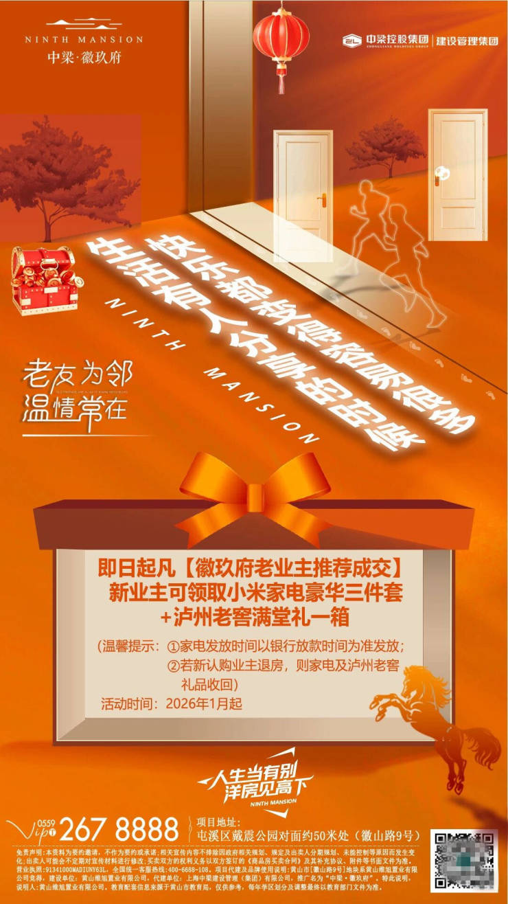 即日起凡【徽玖府老业主推荐成交】,新业主可领取小米家电豪华3️⃣件套➕泸州老窖满堂礼1️⃣箱!