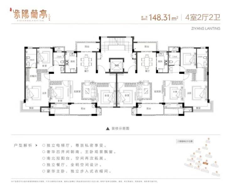 紫阳兰亭31#楼户型建面约148.31㎡,奢华四开间朝南;南北双阳台,空间再次拓展;独立电梯厅,尊崇私密享受;豪华主卧,步入式衣帽间、独立卫浴等,尽享尊贵奢华生活。