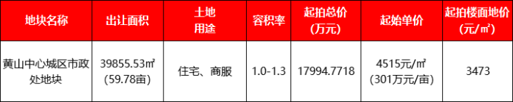 楼面价3473元/㎡,黄山中心城区市政处地块成交