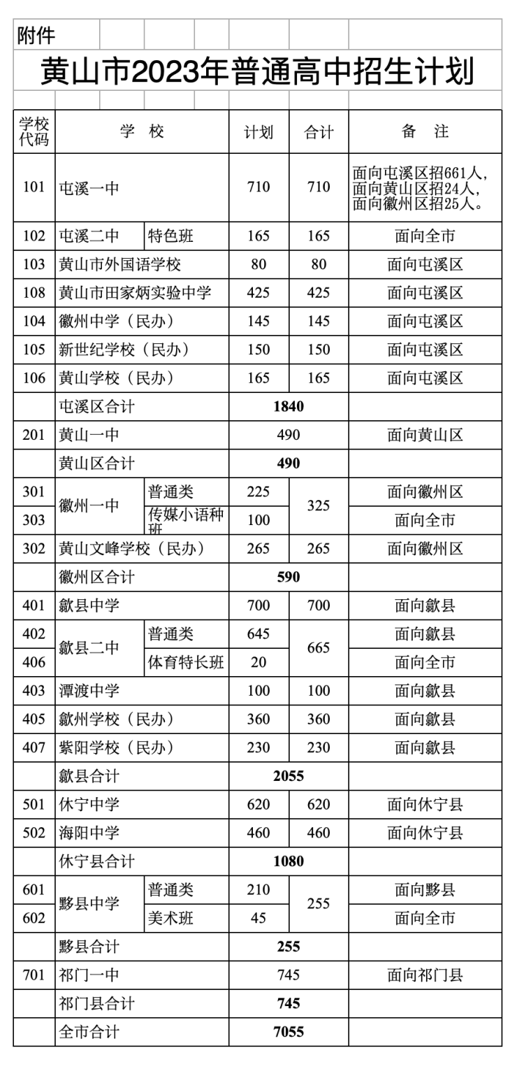 根据《安徽省教育厅关于做好2023年普通中小学招生入学工作的通知》(皖教秘基〔2023〕57号)和《黄山市教育局关于做好2023年普通高中招生有关工作的通知》(黄教基〔2023〕7号)要求,为做好2023年普通高中招生工作,各区县结合各校办学实际,统筹制定辖区内公、民办普通高中学校招生计划。现随文下达全市2023年普通高中招生计划,请认真贯彻执行。