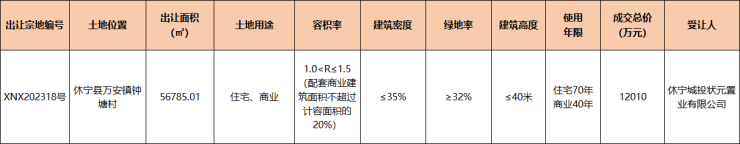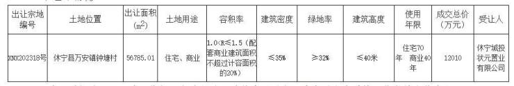 11月30日,休宁县万安镇钟塘村商住用地底价成交,由休宁城投状元置业有限公司竞得,成交总价12010万元,成交面积56785.01㎡(合85.18亩),成交单价141万元/亩(2115元/㎡),成交楼面地价1410元/㎡。