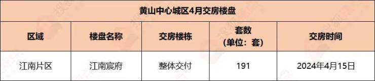 2024年4月,黄山中心城区江南宸府1盘交付,共计191套住宅房源。