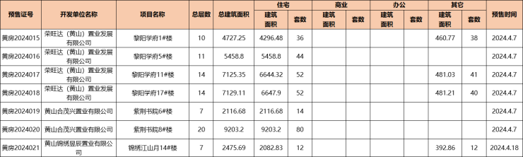 2024年4月,黄山中心城区黎阳学府、紫荆书院、锦绣江山月3盘获预售证,新增可预售房源421套,新增可预售面积38236.08㎡。其中,新增可预售住宅房源290套,新增可预售住宅面积36450.21㎡,新增可预售其他房源131套,可预售其他面积1815.87㎡。