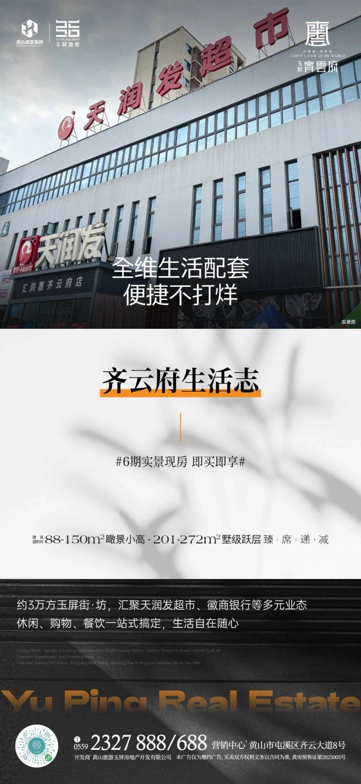 全维生活配套,便捷不打烊。玉屏齐云府约3万方玉屏街.坊,汇聚天润发超市、徽商银行等多元业态休闲、购物、餐饮一站式搞定,生活自在随心。玉屏齐云府,6期实景现房,即买即享!建面约88-150m㎡瞰景小高、201-…