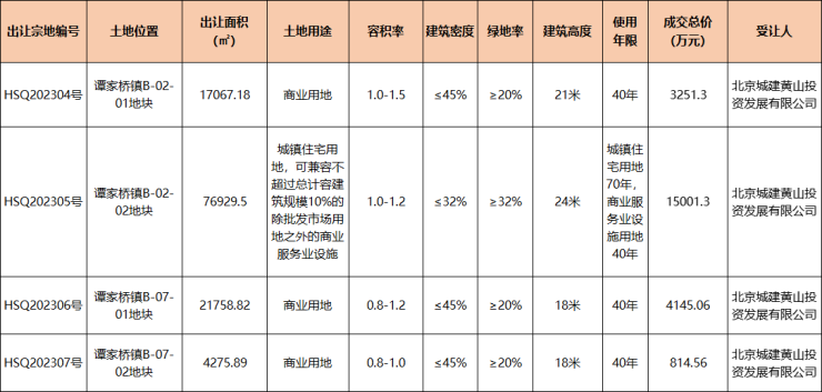 2023年6月21日,谭家桥镇B-02-01地块、谭家桥镇B-02-02地块、谭家桥镇B-07-01地块、谭家桥镇B-07-02地块四宗用地成交,均由北京城建黄山投资发展有限公司以底价竞得。