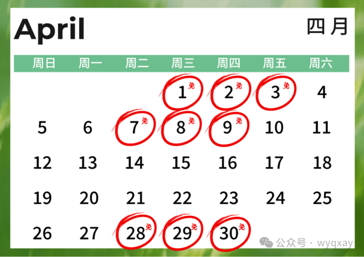 2026年4月1日至4月3日、4月7日至4月9日、4月28日至4月30日、5月6日至5月8日,共12天。