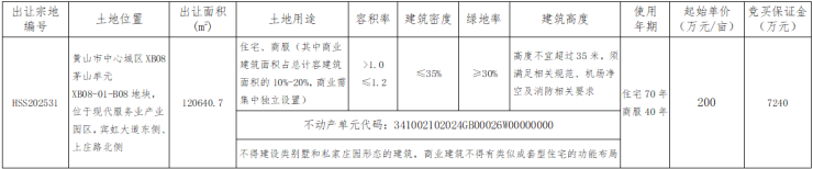 2025年10月31日,黄山市中心城区 XB08茅山单元XB08-01-B08 地块(宗地编号:HSS202531号)挂牌,土地性质为商住用地,宗地位于现代服务业产业园区,宾虹大道东侧、上庄路北侧,总出让面积120640.7平方米(合180.96亩),容积率1.0<R≤1.2,起拍总价36192.21万元,起拍单价3000元/㎡(200万元/亩),起拍楼面地价2500元/㎡,拍卖时间:12月1日15时30分。