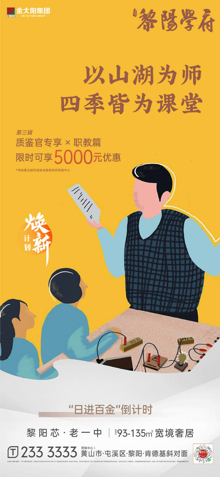 以山湖为师,四季皆为课堂。黎阳学府焕新计划第三辑,质鉴官专享x职教篇限时可享5000元优惠。“日进百金”倒计时,详询置业顾问或致电黎阳学府营销中心。