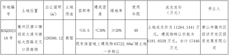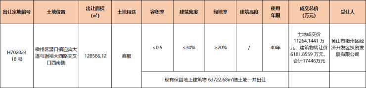 12月21日,徽州区潜口镇1宗商服用地成交,宗地位于徽州区潜口镇迎宾大道与谢裕大西路交叉口西南侧,由黄山市徽州区经济开发区投资发展有限公司底价竞得,成交总价17446万元(含土地成交价11264.1441 万元,建筑物转让价6181.8559 万元),成交总面积128586.12㎡(含 63722.68㎡地上建筑物面积)。