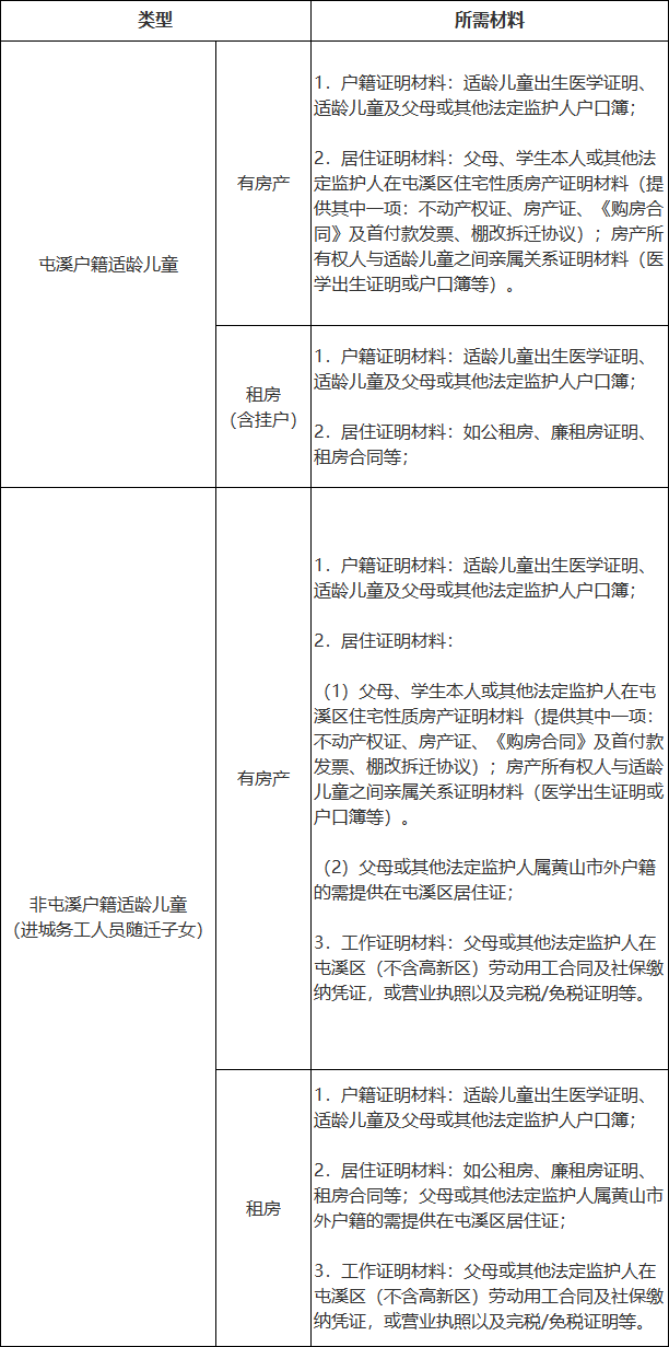 非屯溪区户籍适龄儿童入学,需提供父母在屯溪区稳定居住、工作的证明材料,区教育局将根据父母在屯溪区房产或居住、工作及社保缴纳年限(或完税证明)等情况综合评定,依次相对就近统筹安排就读学校。