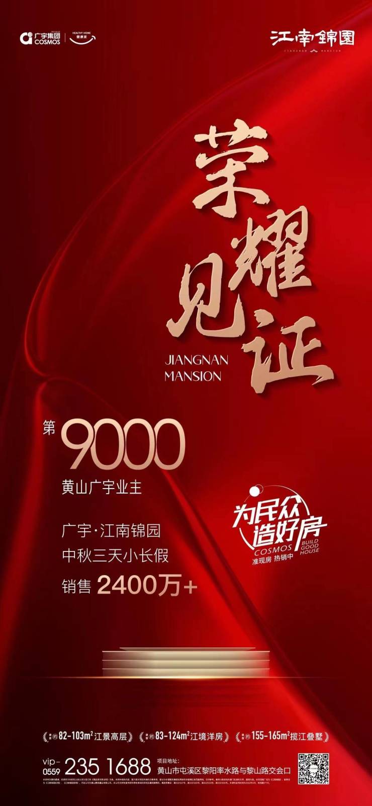 荣耀见证,广宇集团在黄山迎来了第9000位业主!中秋三天小长假,广宇集团深耕黄山20年的较新力作《江南锦园》更是劲销2400万+,红盘实力有目共睹。现江南锦园建面约82-103㎡江景高层、83-124㎡江境洋房、155-165㎡揽江叠墅准现房热销中。