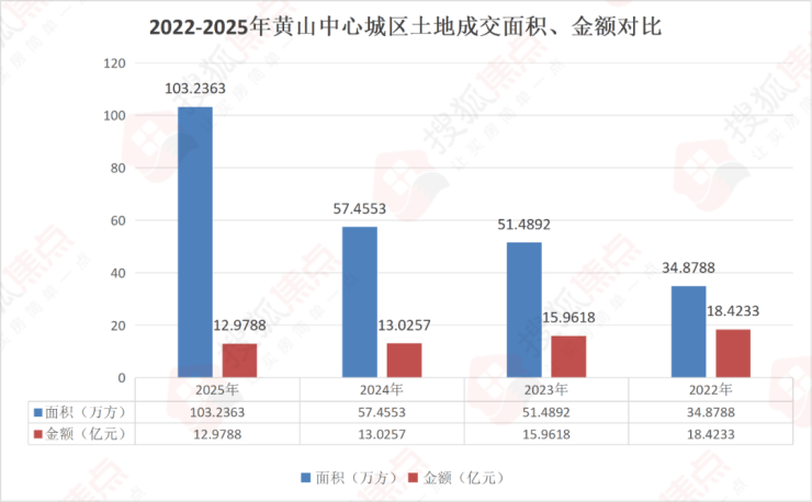 从数据来看,2025年黄山中心城区土地市场呈现出明显的“量价背离”。面积端大幅放量,金额端持续承压。背后的原因也较为清晰: