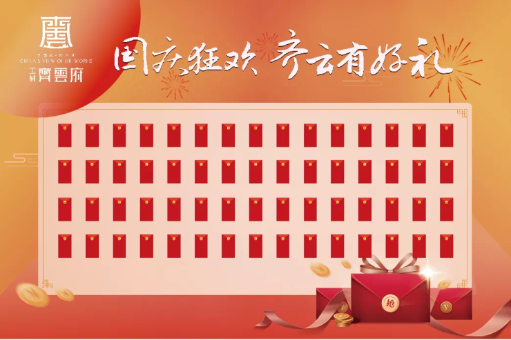 国庆活动期间,线上参与喊口令抢红包活动或到访玉屏齐云府营销中心,即可参与幸运红包墙抽奖(较高可得三万元优惠券),礼品多多,惊喜无限。