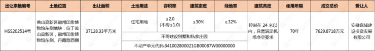 2025年6月,黄山中心城区首宗住宅用地,徽州印象博物馆东侧地块(宗地编号:HSS202514)成功出让,安徽嘉域建设投资发展有限公司底价竞得。成交总价7629.8718万元,成交单价137万元/亩(2055元/㎡),成交楼面地价1027.5元/㎡,无溢价。
