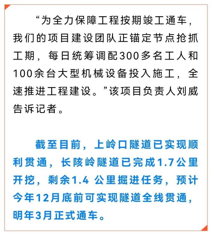 长陔岭隧道建成后,长陔乡至县城的行车距离,将由原来的58公里缩短至40余公里,通行时间由80分钟缩短至60分钟左右,极大改善高海拔山区公路地质灾害频发期,特别是雨雪冰冻天气的通行安全状况,切实提升街源地区8万余名群众的出行效率和生活品质。