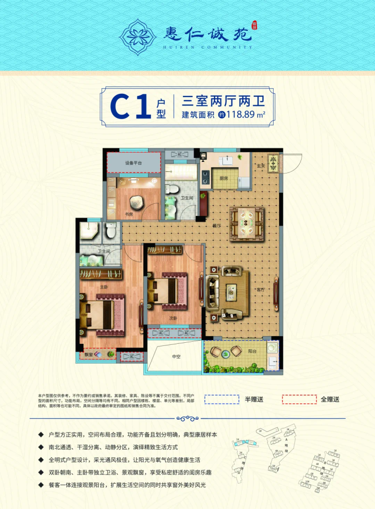 西苑户型南北通透,方正全明,餐客双厅一体设计,南向三开间,更大面积接触阳光与清风,双朝阳卧室,阔景休闲飘窗及阳台,让生活空间层次更加丰富,科学双卫设计,有效解决卫生间使用冲突的问题,更大空间利用率,提高居住幸福感。