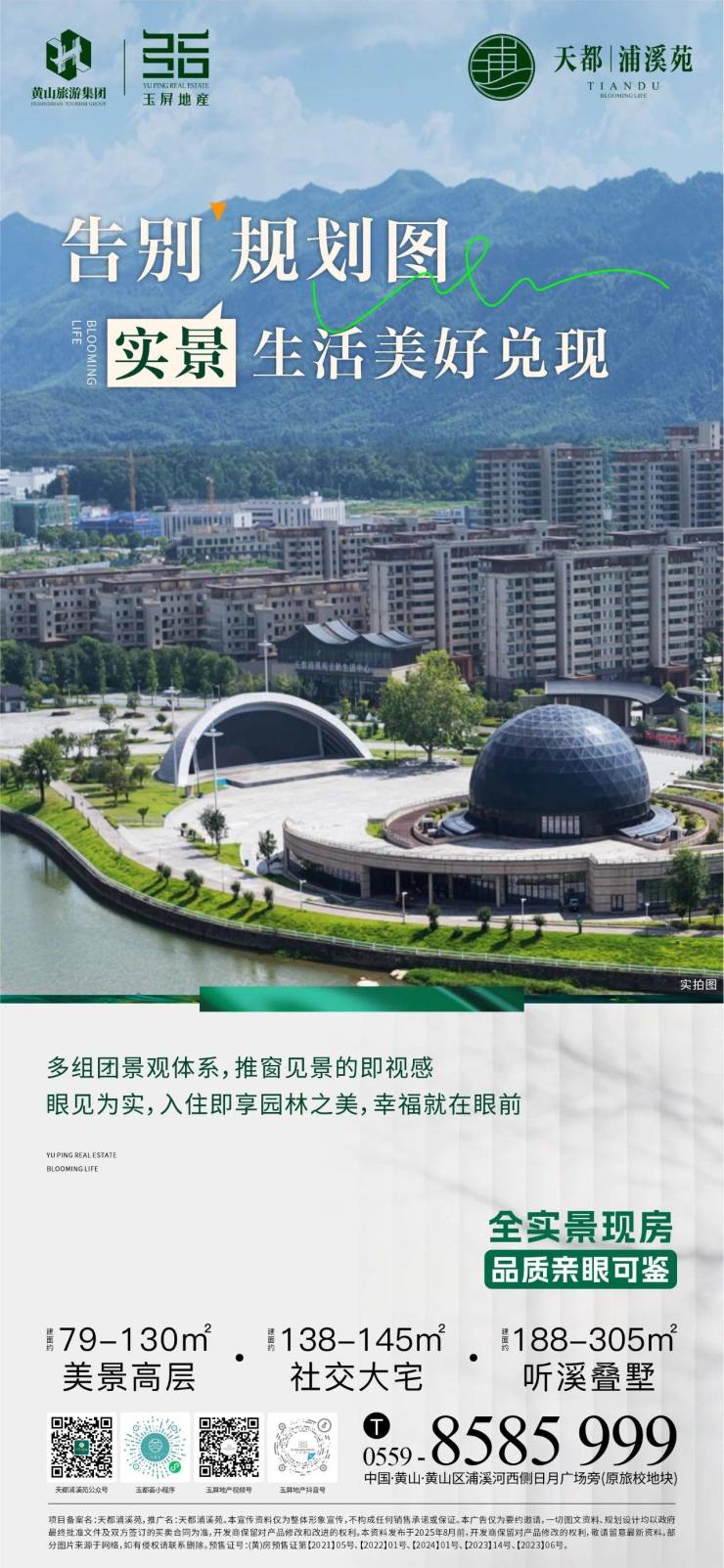 全实景现房,品质亲眼可鉴。天都浦溪苑79-130㎡美景高层、138-145㎡社交大宅、188-305㎡听溪叠墅热售中。